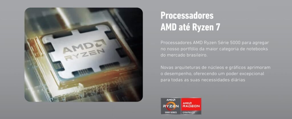 O modelo analisado vem com o processador AMD Ryzen 5 5625U, um chip de 6 núcleos e 12 threads capaz de lidar com multitarefas, edição de vídeos leves e rotinas intensas de trabalho.
